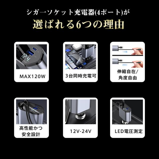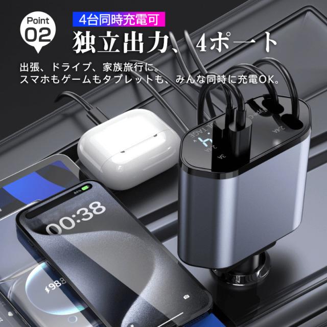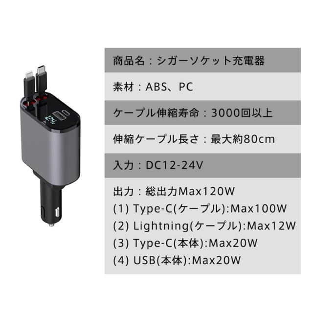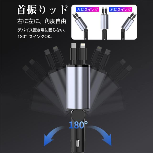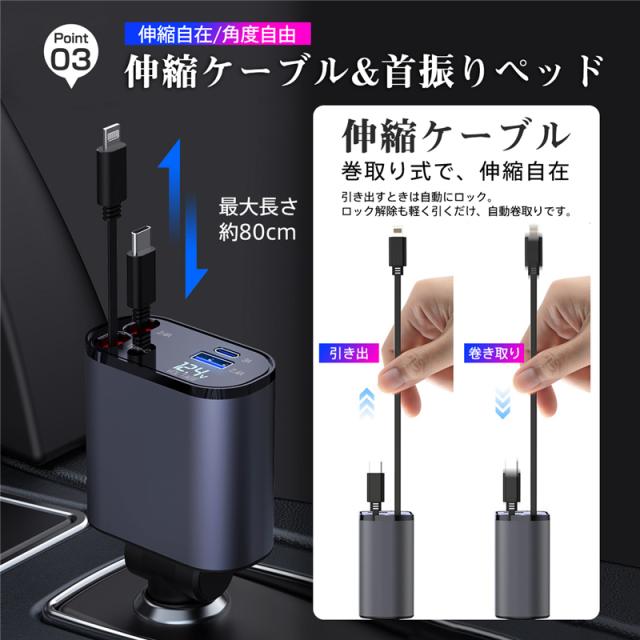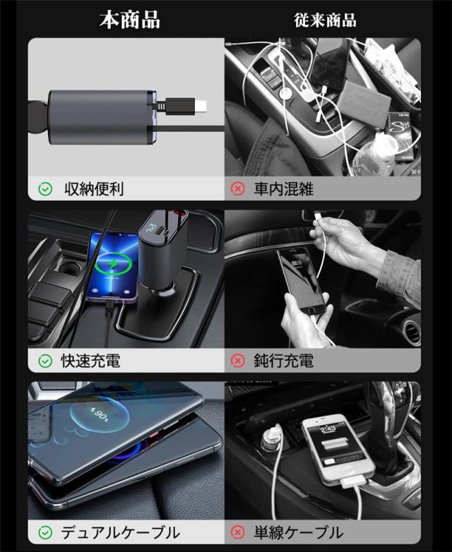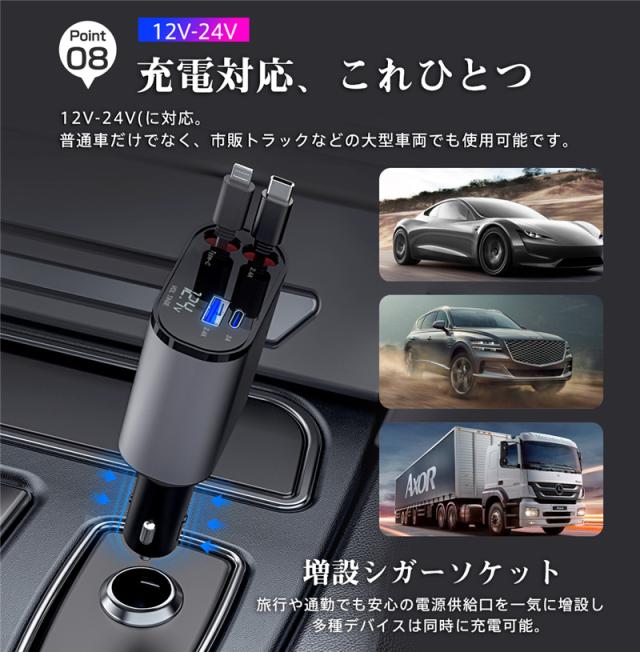 当日発送 シガーソケット カーチャージャー 車載 充電ケーブル 充電器 3in1 リール式 スマホ充電 急速充電 シガーチャージャー 伸縮ケ
