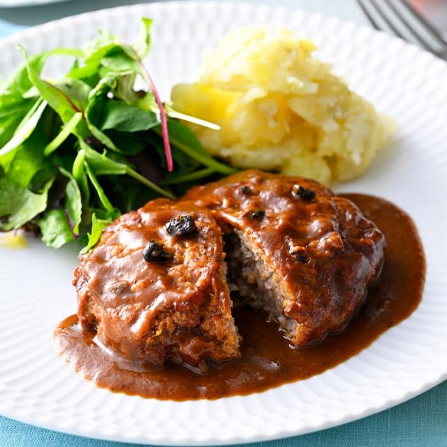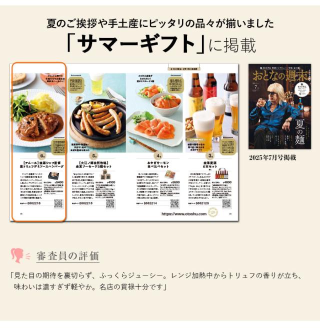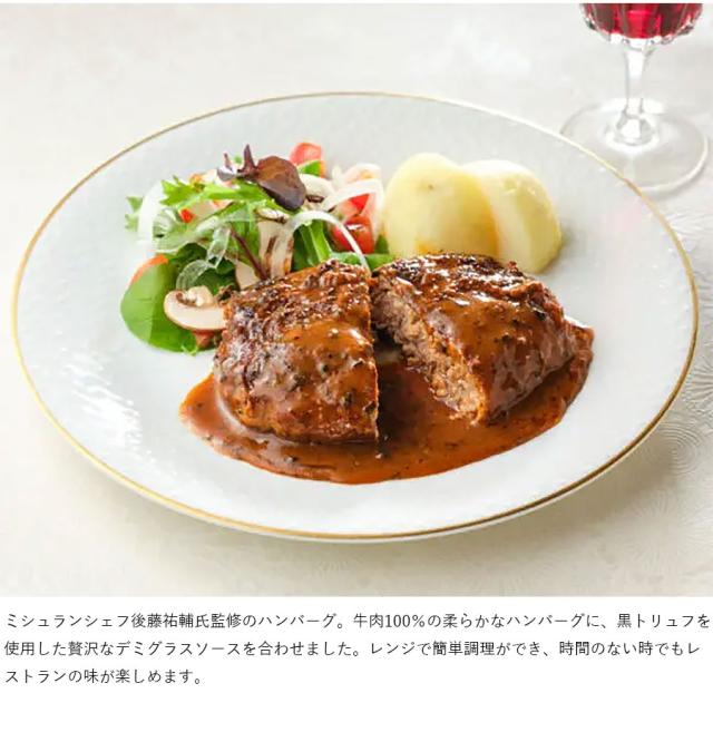 ミシュラン星獲得フレンチのシェフ・後藤祐輔氏が監修。牛肉100%のハンバーグはふっくら柔らかく、デミグラスソースに潜む黒トリュフの香りが味わいをぐっと華やかに。肉の旨みと玉ねぎの食感、芳醇な香りが調和した本格的な味。レンチンの手軽さも贈り物に最適だ。