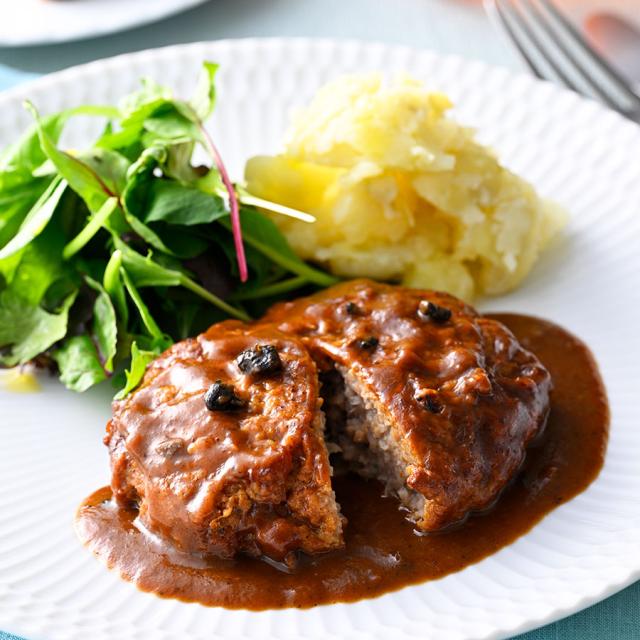 【ハンバーグ】牛肉(豪州、その他)、玉葱、牛乳、牛脂、つなぎ(卵白、パン粉、小麦加工品)、醤油、食塩、コショウ