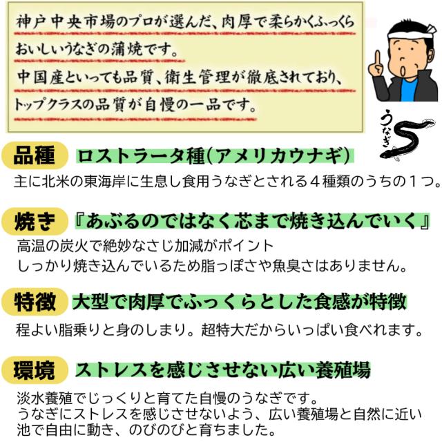 【スタッフより】 この鰻は中国産ですが、品質・衛生管理が徹底されており安心してお召し上がり出来る一品です。 『ロストラータ種』の特徴は大型で肉厚!ふっくらとした食感が特徴です。 無頭処理しており可食部がいっぱいで食べ応え抜群★ うなぎにストレスを感じさせないように広い養殖場でのびのび育ったので程よい脂乗りと身のしまり。 しっかり焼き込んでいるので脂っぽさや魚臭さはありません。