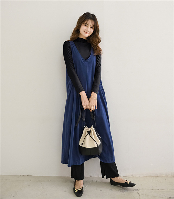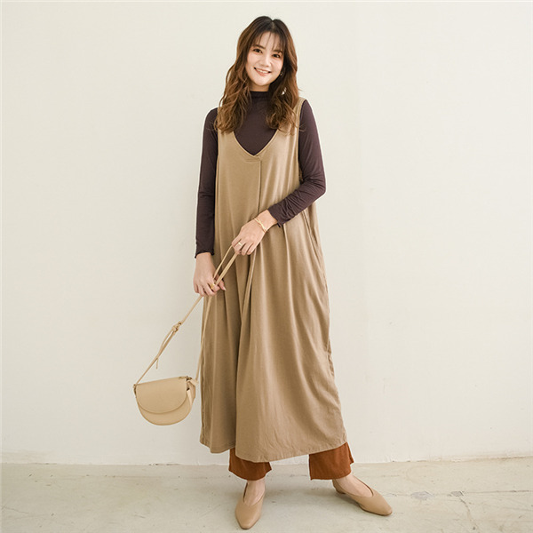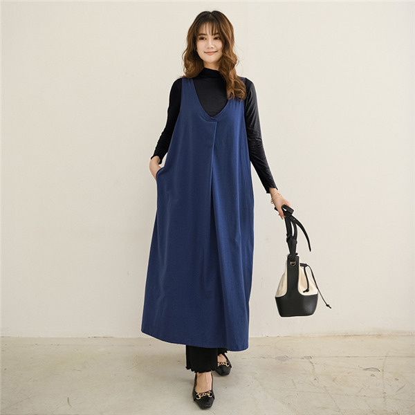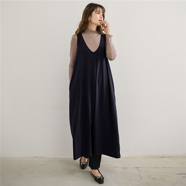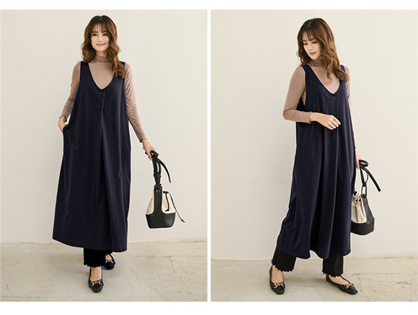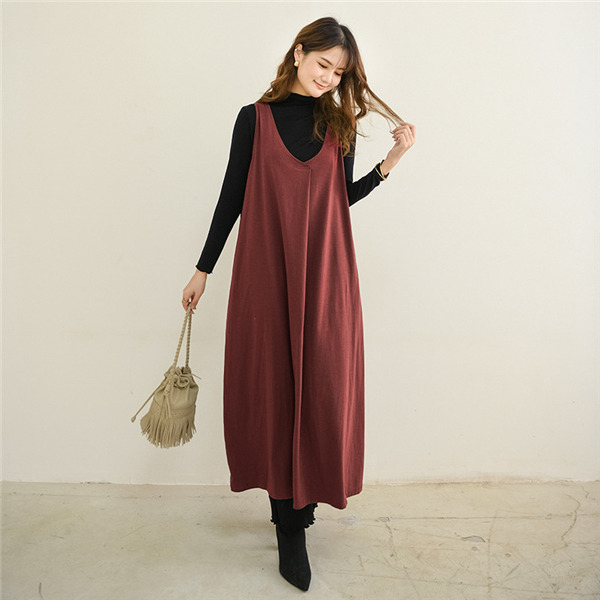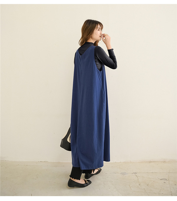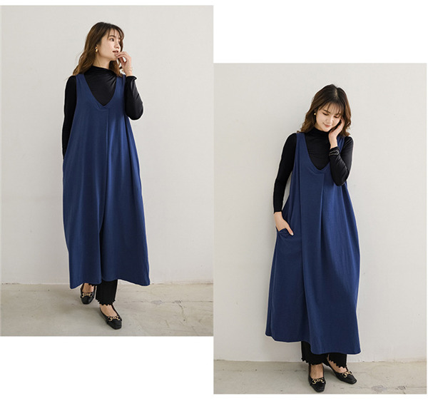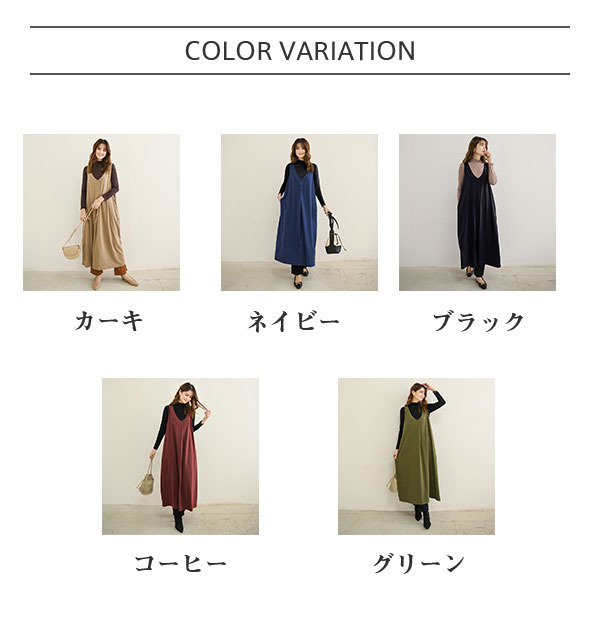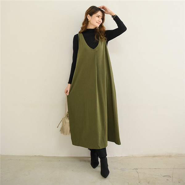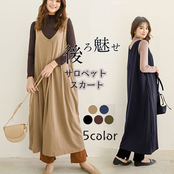 サロペットスカート ワンピース レディース オールインワン ジャンパースカート 春秋 シンプル vネック 無地 体型カバー ゆったり Aライン