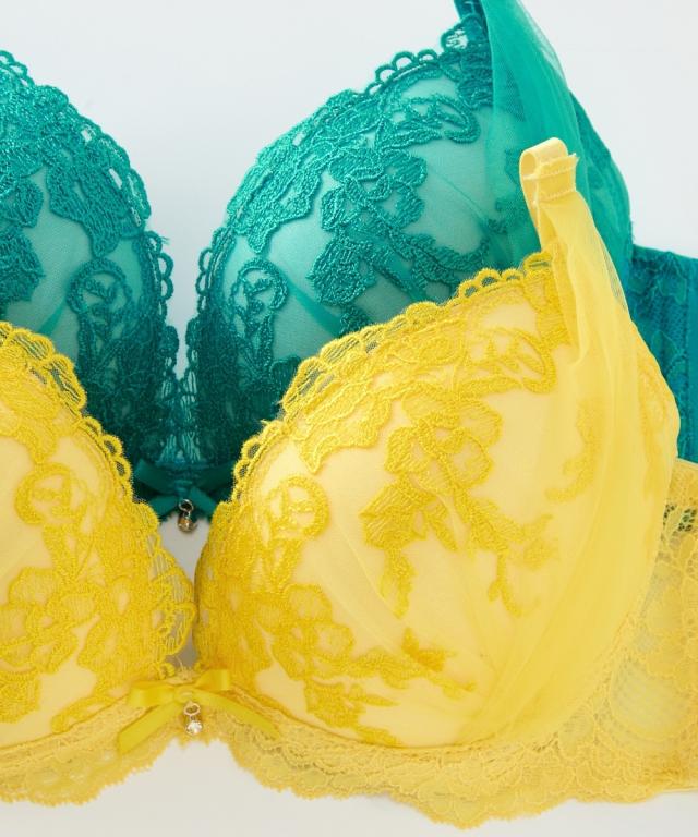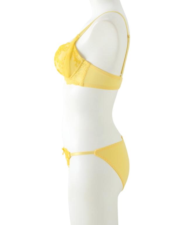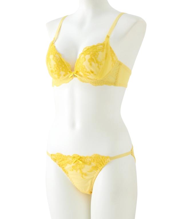 華やかなトロピカルカラーの花刺しゅうにサイドチュール仕様をほどこしたブラとショーツのセットです! ショーツはサイドストリングでセクシーに演出。