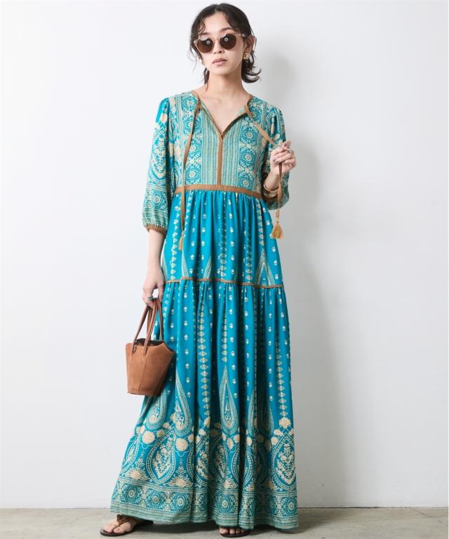 1枚で主役級のエスニック柄マキシワンピース ■デザイン トレンドに左右されないエスニックパターンが華やかなデザイン。 切替え部分にいれた無地のパイピングデザインが引き締め効果も。 長めの5分袖で二の腕を程良くカバーし、女性らしさもプラス。 レーヨン素材で落ち感があるので着やせ効果も期待できます。 ■素材 落ち感があり肌触りのいい薄手のレーヨン素材を使用。 華やかなパネル柄のエスニックプリント。 ■おすすめのスタイリング 薄手素材なので少し透け感があります。気になる場合はキャミソールなどのインナーをご着用ください。