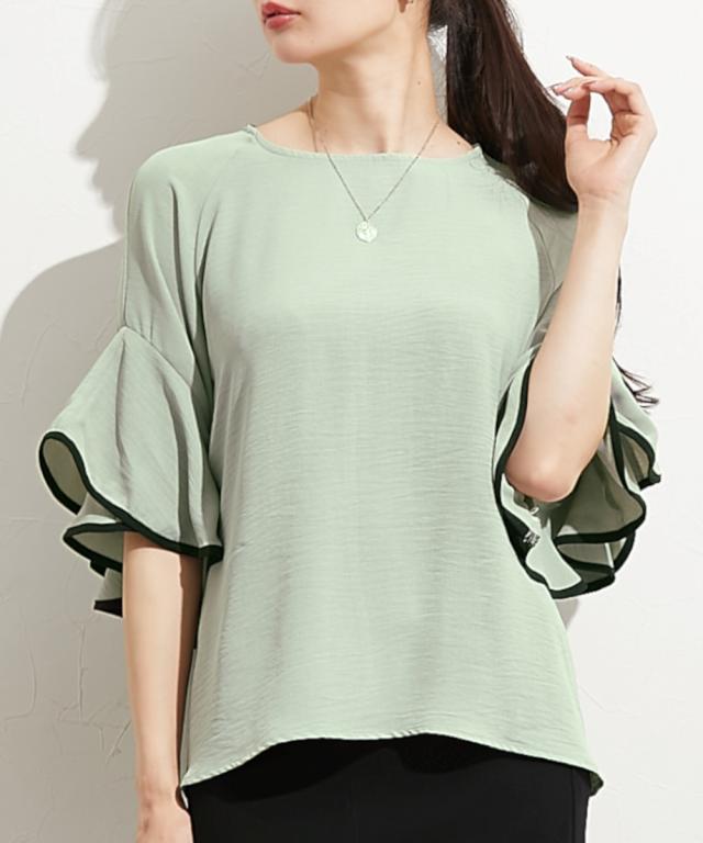 長い夏におすすめのひんやり接触冷感な高機能ブラウス ■デザイン ボリュームのあるフレア袖とドロップショルダーがかわいいデザインブラウス。お袖のボリューム感と配色使いで二の腕をほっそりと華奢に見せてくれそうなアイテムです。着丈も短すぎないのでコーデに合わせやすいアイテム。 ■素材 しぼ感のあるきれいめ素材で仕立てたブラウス。UVカット機能・汗じみ防止・接触冷感生地を使っているのでこれからの季節にマストハブなお悩み解決アイテム! ■おすすめのスタイリング オンからオフまで着まわしやすいデザインブラウス。オフスタイルにはデニムパンツ合わせ、お仕事にはきれいめのスカートコーデもおすすめです。