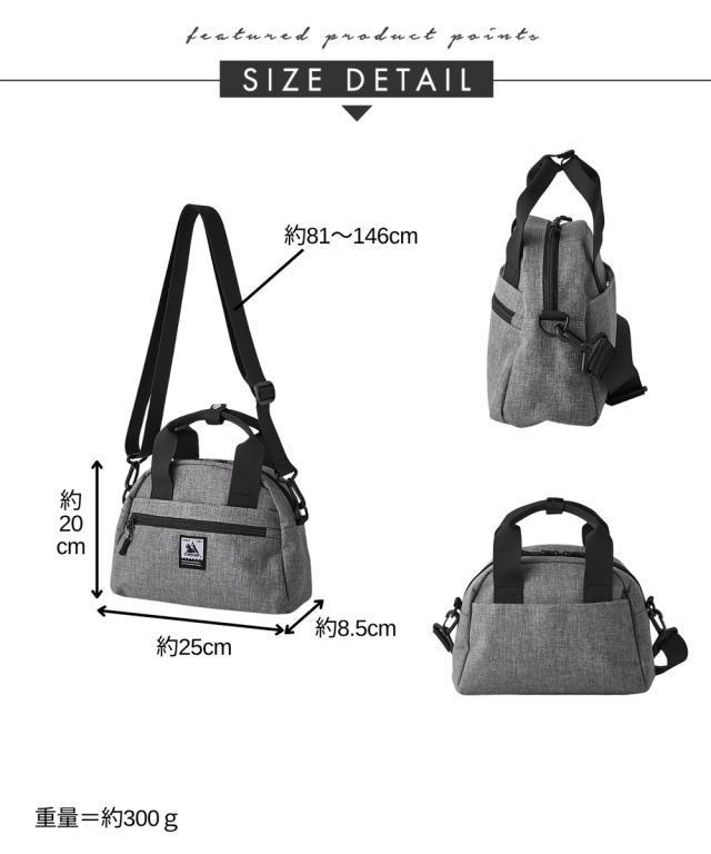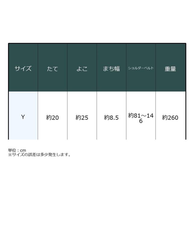 材質=ポリエステル(はっ水) サイズ=たて約20×よこ約25×まち幅約8.5cm 開閉=ファスナー ポケット=中:2個(メッシュオープン1、ファスナー1)外:3個(ファスナー1、マグネット2) ショルダーベルト=約81〜146cm 調整可 取り外し可 重量=約260g 原産国:中国製 備考:単位:cm ※サイズの誤差は多少発生します。