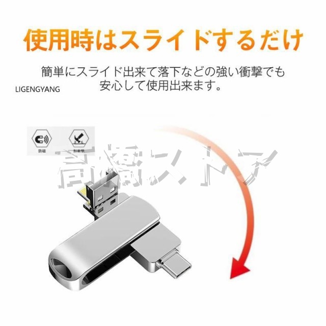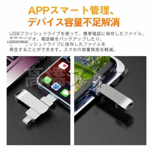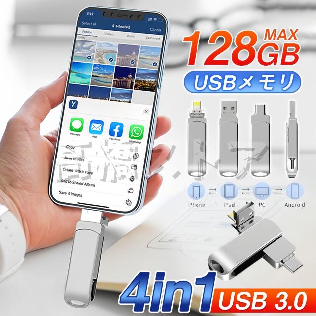 USBメモリー フラッシュメモリー 4in1 128GB 64GB iPhone Android type-c PC対応 ライトニング 大容量 容量不足解消 コンパクト スマホ用 高速転送 多機能 ギフト