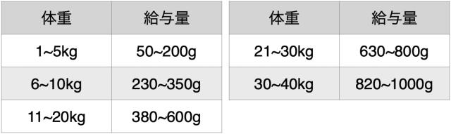・給与量は犬種、体質、生活環境、活動量、年齢、季節や気候などにより大きく違ってきます。給与目安量を目安として理想的な体重を維持できる最適な量に調整してください。