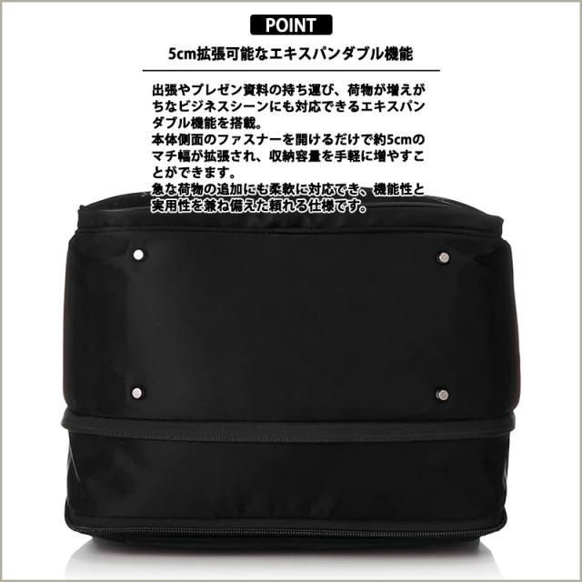 ファスナーを開けるだけでマチ幅が5cm拡張。資料や衣類など、急に荷物が増えた際も安心です。