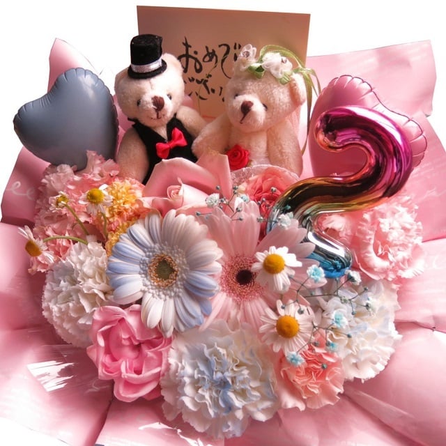 【送料無料】結婚記念日 交際記念日 記念日 花 お花 お祝い 2年 2周年 数字入り ウエディングベアー ハートバルーン入り フラワーアレンジメント お花はデザイナーにおまかせ♪ ◆生花使用 ◆ご希望の数字で作成します