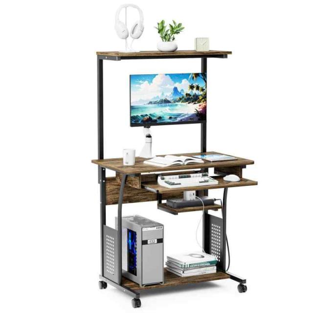 DEWEL パソコンデスク 机 pcデスク パソコンラック 収納ラック付き 木製 テーブル 木目柄 キャスター キーボードテーブル付き PCラック 省スペース シンプル メラミン加工 ワークデスク学習机 80X50X135cm (木目調)
