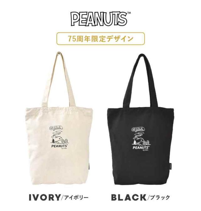 PEANUTS75周年を祝う限定デザインのトートバッグ。天面ファスナー仕様で、貴重品が飛び出さず安心◎A4サイズがすっぽり入るサイズでマチもあるからたっぷり収納可能。お仕事やお出かけにぴったりです。