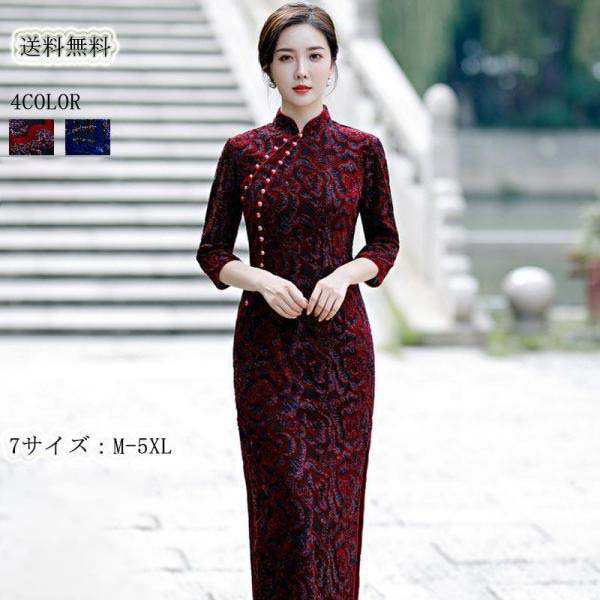 チャイナドレス ロング丈 チャイナ服 7分袖 柄 秋 ドレスワンピース 大きいサイズ スリット パーティードレス 披露宴 結婚式 上品 オシャレ