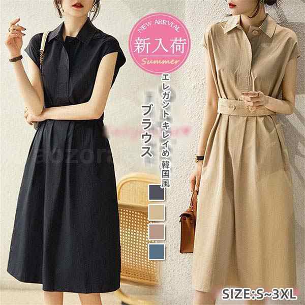 シャツワンピース レディース 40代 きれいめ マキシワンピース 春夏 半袖ワンピース 無地ポロ襟 リボン Aラインスカート オシャレ韓国風 大人ゆったり 通勤OL