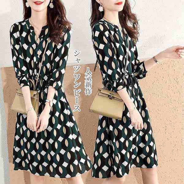 連携キーワード:シャツワンピース レディース 40代 きれいめ 膝丈ワンピース 春夏 長袖ワンピース プリント Vネック aラインスカート オシャレ韓国風 大人 通勤OL 体型カバー30代 50代