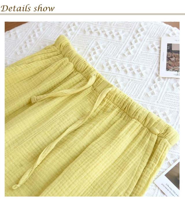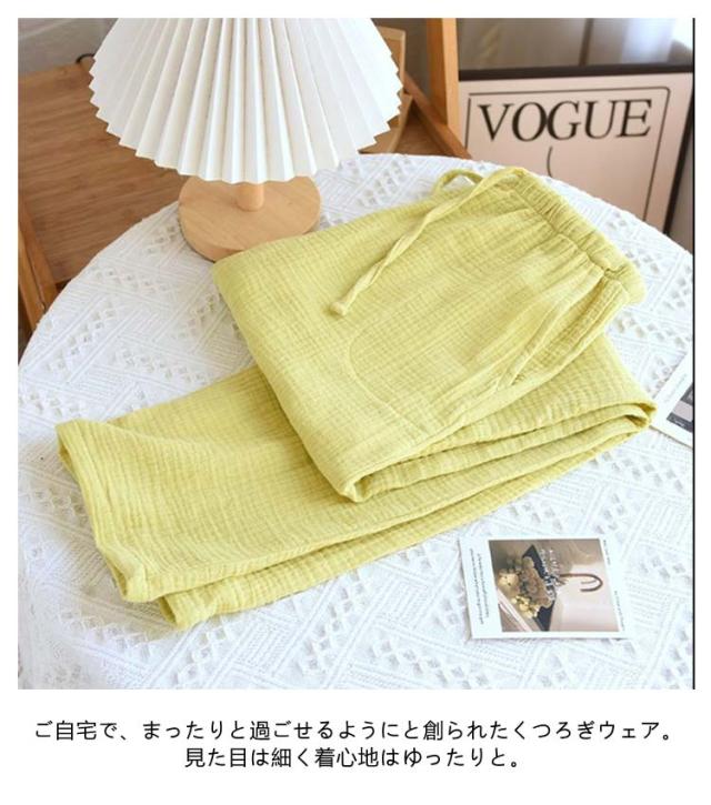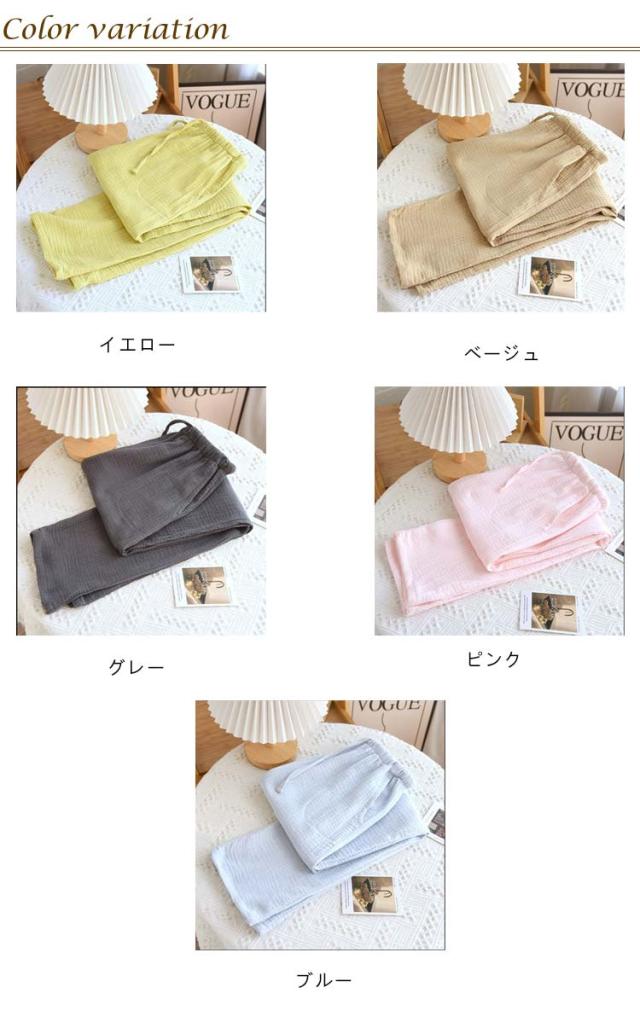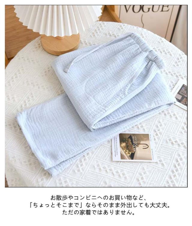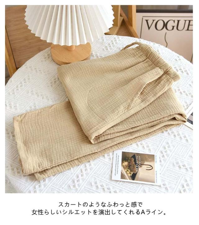| 暑い夏に重宝♪ サラッとした肌ざわりの涼やかルームパンツ! 通気性に優れた綿100%素材で、脚にまとわりつかず暑い日にも一日中快適に着こなせます。目で肌で感じることが出来る先染めならではの風合いです。 ダブルガーゼ生地を使用していますので、汗をかいても通気性、吸水性が良く快適に過ごせます。 また、ガーゼを2枚重ねたダブルガーゼは肌に優しいので、敏感肌の方にもおすすめです! ご自宅で、まったりと過ごせるようにと創られたくつろぎウェア。見た目は細く着心地はゆったりと。スカートのようなふわっと感で女性らしいシルエットを演出してくれるAライン。 お家でのリラックスタイムはもちろんアウトドアなど外出にも最適。ご自宅でまったりと過ごせるようにと創られたくつろぎウェア。年代問わずに着用できるシンプルなデザインが嬉しい。 お散歩やコンビニへのお買い物など、「ちょっとそこまで」ならそのまま外出しても大丈夫。ただの家着ではありません。 | |