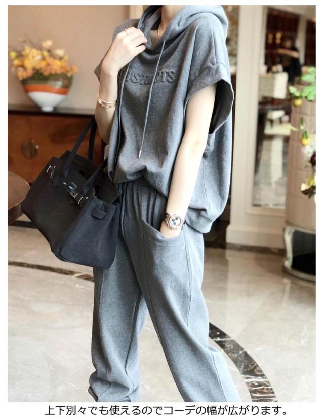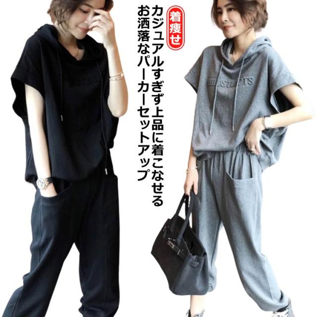 スウェット スウェットパンツ レディース 2点 夏 カジュアルセットアップ おしゃれ 半袖 ジャージ 無地 カジュアルセットアップ 7分丈パンツ 上下セット ゆったり 着痩せ 体型カバー フード付き 大きいサイズ シンプル 部屋着 運動着 スポーツ お出かけ ギフト ダンス衣装
