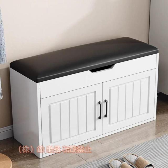 クッション付き靴ベンチ、パッド入りシート付き収納ベンチ 白い木製の靴の収納ベンチ 株式会社錦 クラムシェルデザイン、2つの棚 バルコニー用、廊下