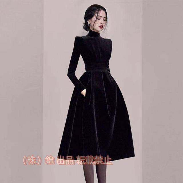 パールベロアワンピース パーティードレス レディース ロングワンピース 春物 きれいめ 韓国風 Aラインワンピ 長袖 上品 ハイネック お洒落 ファッション 高級感 結婚式 通勤 OL 披露宴