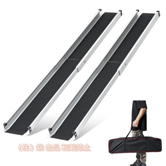 長さ調節可能なスロープ: 5FT:(最大時)約152CM、(最小時)約83.5CMの2段階調節。横幅は18.9CMです。お薦め使用高さ38cm。ご購入前に使用サイズを確認ください。軽さと耐久性を兼ね:該製品は2個1セット。専用バッグ付きだから持ち運びに便利です。軽量で丈夫なアルミ製。最大荷重272kg。アルミ素材のため、使用中ある程度にたわみがあることは正常で、不使用時また回復になる。滑り止め加工:製品表面と裏面に滑り止めパッド付いて、使用中のズレを防止できて、車椅子?台車?自転車?カートのスムズーな移動に。曲がっているヘッド部で、床面にしっかり接触し、より安全安心。端末の延長プレートにより、車椅子が簡単に登れる。車椅子スロープとして最適。段差解消スロープ:車椅子スロープはステンレス製ロック付き、長さ調整可能!車椅子用のスロープになり、ご自宅をバリアフリー対応に! 台車用スロープになり、倉庫や事務所内での段差を解消し、台車による荷物の運搬をスムーズに!