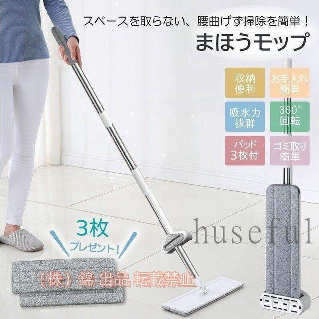 フローリング モップ 業務用 長い 水切り 替糸 フロアモップ タイル床 タイルフロア 自立式モップ 拭き 乾拭き フラットモップ マイクロファイバー 簡単 ステンレス製 モップパッド3枚付き まほうモップ 電動 バケツ 回転 必要なし重量 760gサイズ 梱包時(56 x 15 x 8cm)商品内容 本体 予備パッド3枚(全部4枚)素材:モップクロス:ポリエステル手軽にしっかり水拭き掃除ができる!立ったままで、洗う?絞る?拭くができるモップです。持ち運んで広い場所のお掃除にもおすすめです。柄がフラットになるので、狭いすき間も、奥まで拭けます。洗って何度も使える、脱着式モップクロスで経済的です。マイクロファイバーが細かい汚れもキャッチ!※サイズはメジャーによるメーカー平置き実寸サイズです。若干の誤差はご了承ください。