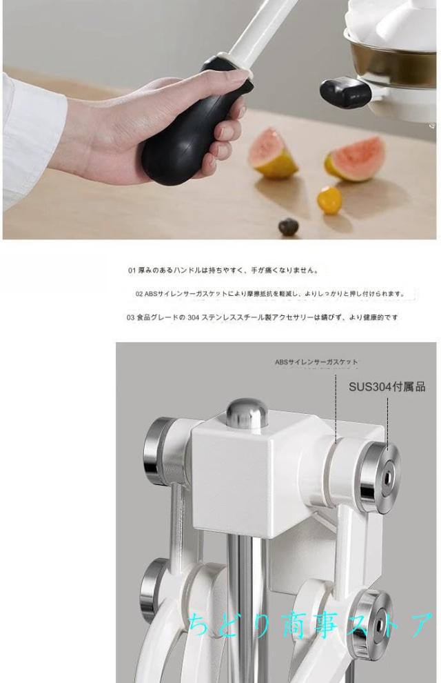 1、手動ジューサー、食品と接触する部分はすべて304ステンレス鋼で、構造がしっかりしていて、耐腐食。大口経ジュース出口設計で、ジュースの流出が速くなる。U型ベース、使用時により安定していて、滑り防止。