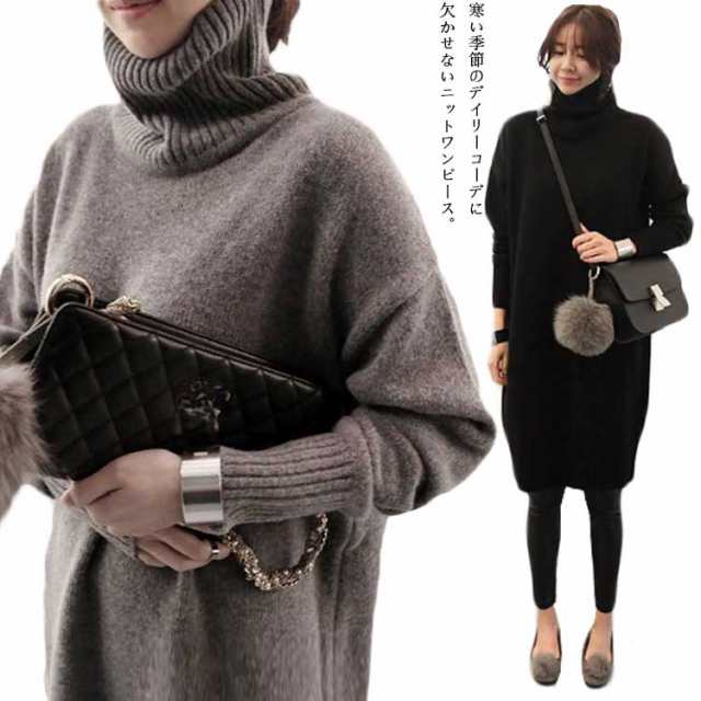 ざっくり ニットワンピース ハイネック 長袖 ニット タートルネック オフタートル 無地 レディース ロングワンピース ロング丈 ニットワンピ 厚手 防寒 秋冬 黒 ブラック グレー ゆったり
