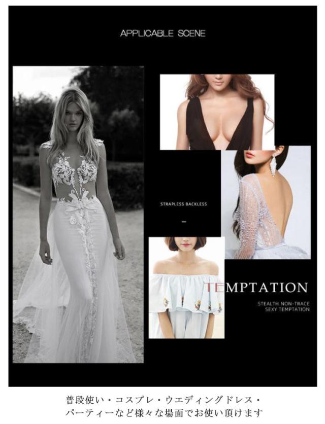| ストラップレスなのにバストを持ち上げるプッシュアップヌーディーブラ 柔らかいシリコン素材なのでバストにぴったり密着するからとってもナチュラル! 下からグイっと持ち上げながら貼り付けると、バストがキュッと上がってセクシーなバストに♪ ストラップレスだから、オフショルダーや背中開きの服を着る時にオススメ♪ 普段使い・コスプレ・ウエディングドレス・パーティーなど様々な場面でお使い頂けます | |