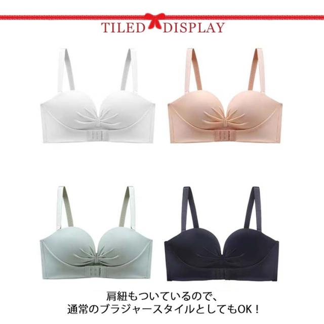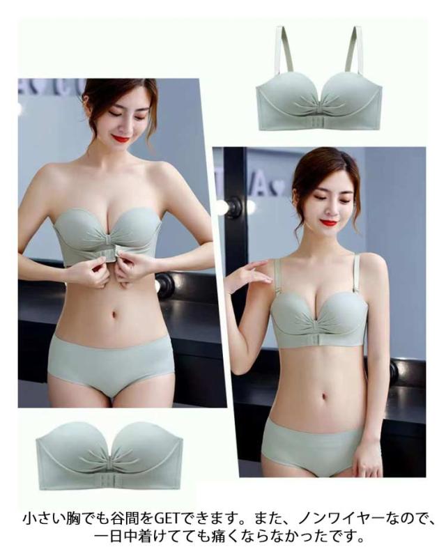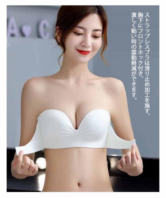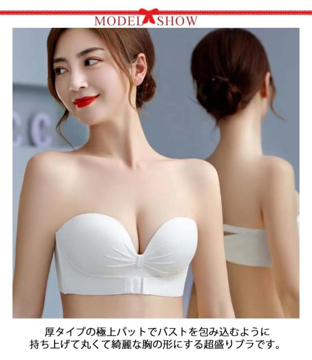 | 3重滑り止め加工でずれ落ちにくいストラップレスブラ。 ストラップレスブラは滑り止め加工を施す、胸下にフロントホック付き、激しく動い時の震動軽減ができます。 バックストラップも付きでずれ落ち防止! 厚タイプの極上パットでバストを包み込むように持ち上げて丸くて綺麗な胸の形にする超盛りブラです。 立体感のある厚手パッド×脇高設計で、バストを寄せ上げ、綺麗なバストラインを作り上げてくれます。 小さい胸でも谷間をGETできます。また、ノンワイヤーなので、一日中着けてても痛くならなかったです。 ドレススタイルの他、オフショルや夏のファッションにも大活躍間違いなし! 肩紐もついているので、通常のブラジャースタイルとしてもOK! | |