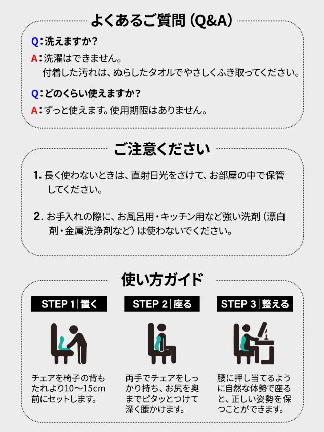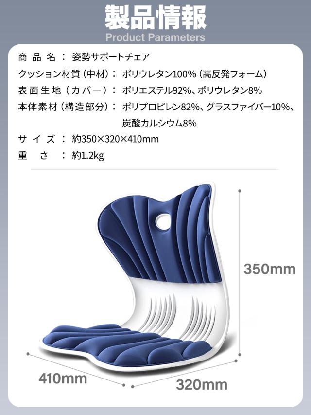 商品名: 姿勢サポートチェア サイズ: 約350×320×410mm(縦×横×奥行) 重量: 約1.2kg |