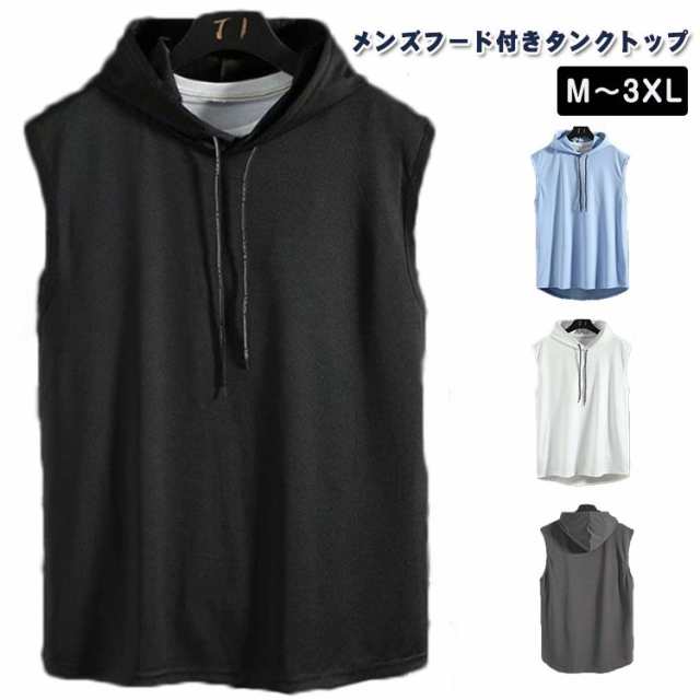 おしゃれ フード付き メンズ パーカー ノースリーブ 夏用 運動着 プルオーバーパーカー 無地 ノースリパーカー フード付き タンクトップ ウエア トップス カットソー スポーツ トレーニング カジュアル 大きいサイズ 男性用 夏服 部屋着