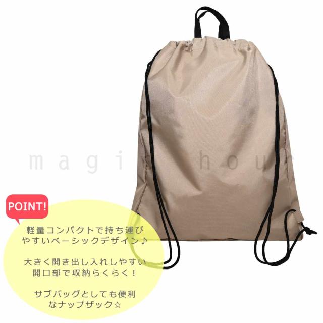 プールやスポーツ時にも大活躍!大きめアウトポケット付きの定番人気のナップサック型バッグ。 濡れた着替えやタオル、シューズなどのジムや部活用としても便利♪浅めのマチでたたみやすい! 軽くてとてもコンパクトになるので、バッグの中に忍ばせておくのも◎ 巾着状にしぼれて収納らくらく♪ サイズ: 高さ 44cm, 幅 36cm, マチ 7cm(約) |