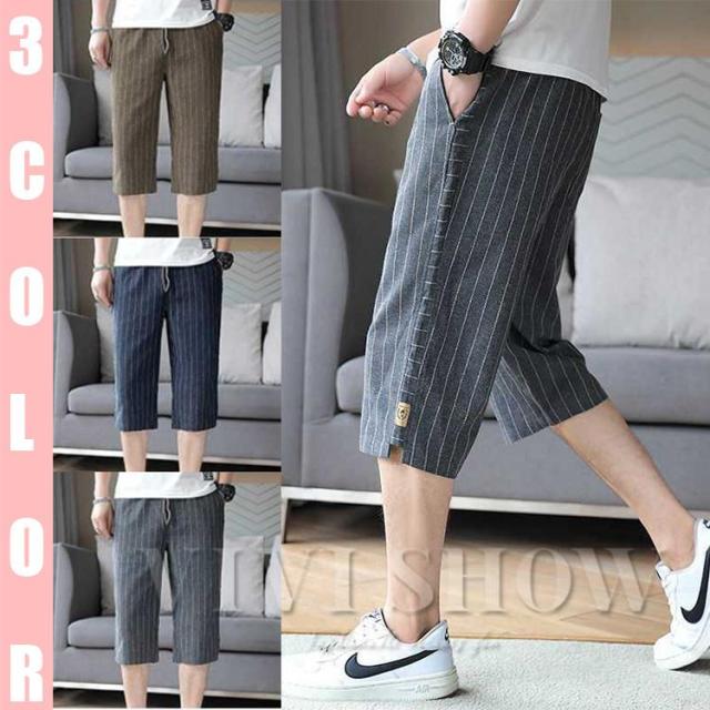 クロップドパンツ メンズ 7分丈 綿麻 リネンパンツ ハーフパンツ ショートパンツ 太め ストライプ ゆったり 涼しい