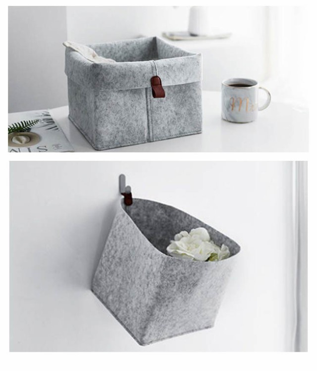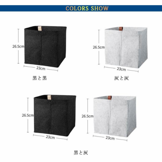 | 【商品名】フェルトバスケット 【素材】フェルト生地 【サイズ】展開時:23*26.5cm 【特徴】雑貨・リモコン・小物からおもちゃ、食品ストック、雑誌などなんでもバサッとたっぷり収納。フェルト生地は、中に収納したものを衝撃から保護する役割があります。硬いものを収納する場合、フェルトなので床を傷つけないのも嬉しいポイントです。インテリアに馴染む黒と灰の2色を部屋に置いて、おしゃれに収納。使わない時は折り畳んでコンパクトに。 | |