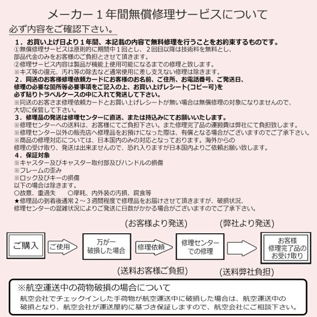 ■お手入れ方法。キャリーケース表面の汚れは、中性洗剤を水で薄めたものに浸した柔らかい布を固く絞り、汚れを拭き取って下さい。シンナー・ベンジンなどの揮発性の薬品は変質や変色の原因になりますのでご使用しないで下さい。ご使用後は汚れ、ほこりを取り除き、陰干ししてから風通しのよい場所で保管して下さい。直射日光・湿気の多い場所での保管は、カビや変色、色移り、金属部分の錆びの原因とりなりますのでご注意下さい。