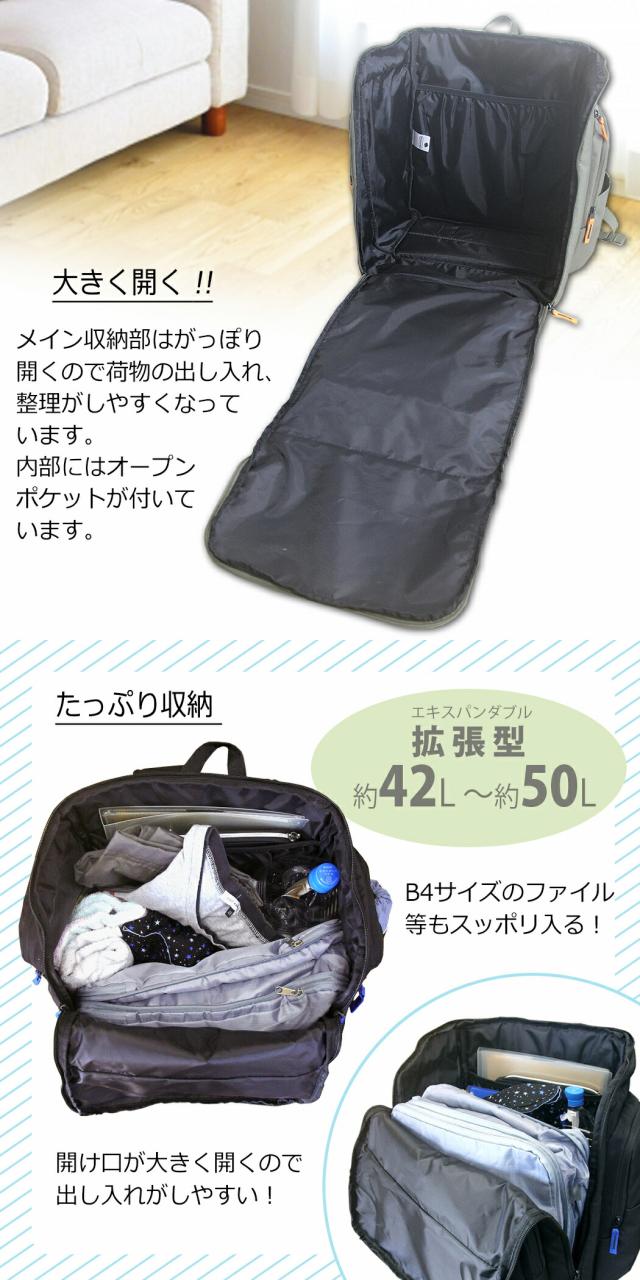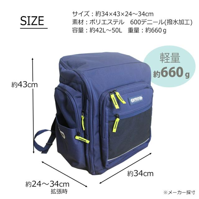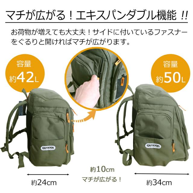 サブリュック アウトドア 拡張 リュックサック 42リットル 50リットル 撥水 リフレクター ホイッスル付き エキスパンダブル リュック バックパック デイパック 男女兼用 メンズ レディース 多機能 自然学校 部活 スポーツ OUTDOOR od-1162 B4ファイル対応 開けやすい