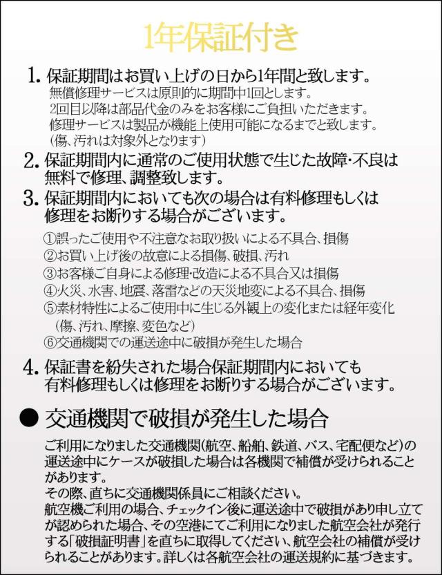 ■雨・水気にご注意下さい。このキャリーケースは防水ではありません。雨水の貼った路面での走行は、内部に雨水が浸み込み荷物を濡らしたり、金属部分を錆びさせる恐れがあります。雨天時のお取り扱いには十分ご注意下さい。