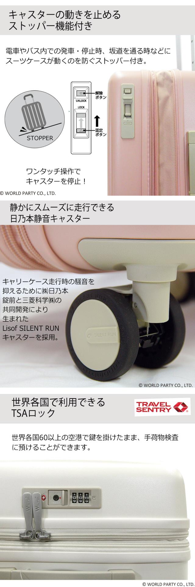 ■ポイント/ボディには耐久性あるポリカーボネートを使用。キャスターにはスムーズで快適な走行を提供するサイレントダブルキャスターを採用。・かわいい3点収納ポーチ付き。・旅先で荷物が増えても安心のエキスパンダブル機能を搭載。・TSAロック標準装備。・ポケット、クロスストラップ付きでパッキングのしやすさを考慮した内装。・キャリーバーはシーンや身長に合わせて段階調整が可能。