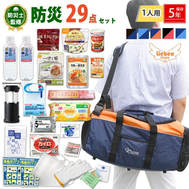 防災セット 1人用 29点セット 防災グッズ 非常用持出袋 集中豪雨 備蓄おにぎり エアベッド 防災バッグ ボストンバッグ cr-327 災害対策 防災用品 地震対策 防災トイレ リフレクター 反射材 避難グッズ 家族 避難用品 保存水 送料無料 防災レビュー リーベン 327