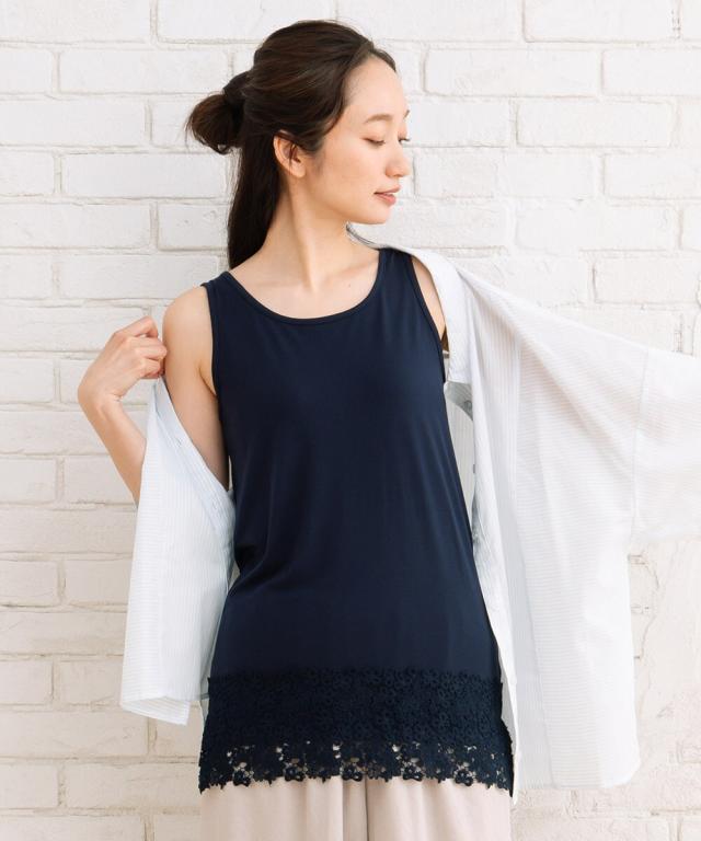 きれいめパンツと合わせればオフィスカジュアルに、カーディガンやジャケットのインナーにもおすすめ。タンクトップをインナーとして着用し、Tシャツやシャツブラウスの裾のレースをチラ見せするスタイルも◎シンプルなアイテムにレースのアクセントが加わり、おしゃれ度がアップします。様々なアイテムのインナーとして幅広く着回せるアイテムです。