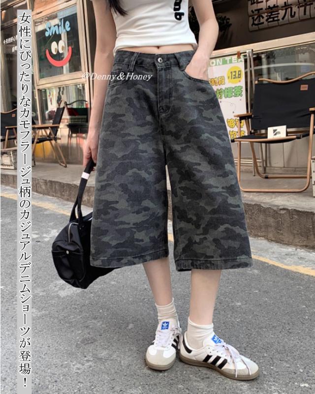 ◎女性にぴったりなカモフラージュ柄のカジュアルデニムショーツ、カジュアルでありながらもおしゃれを楽しめます。