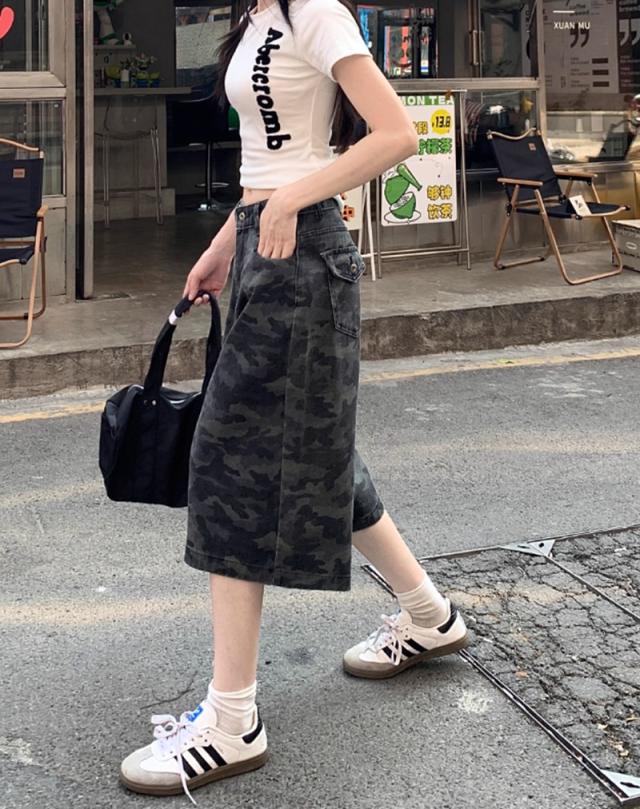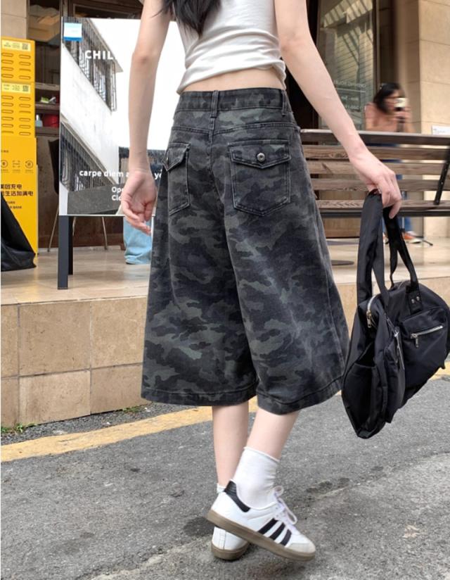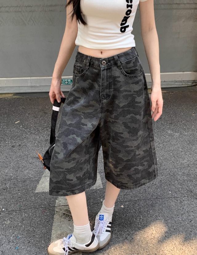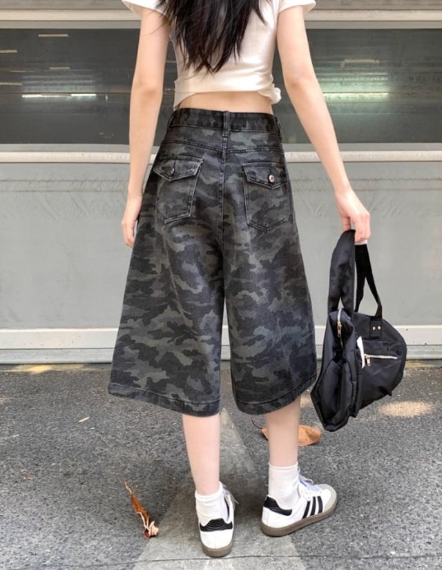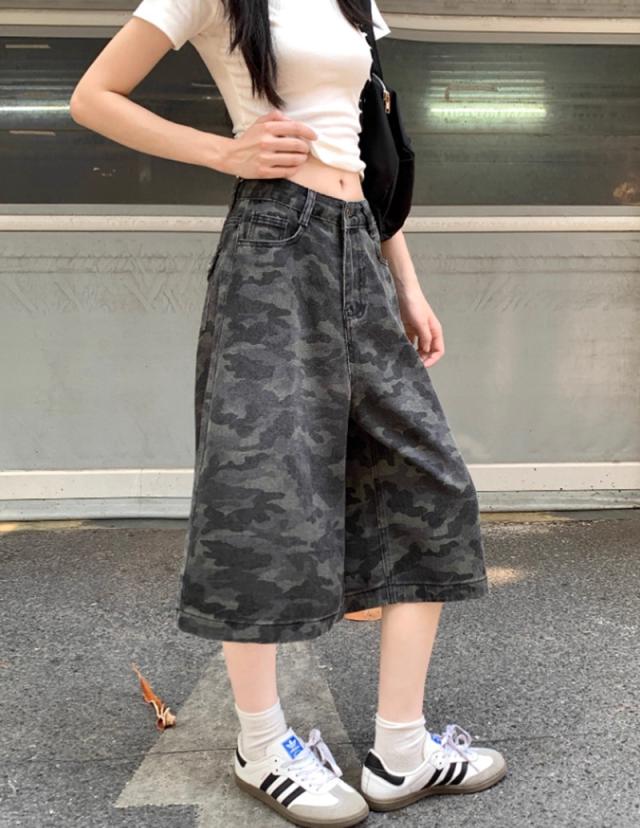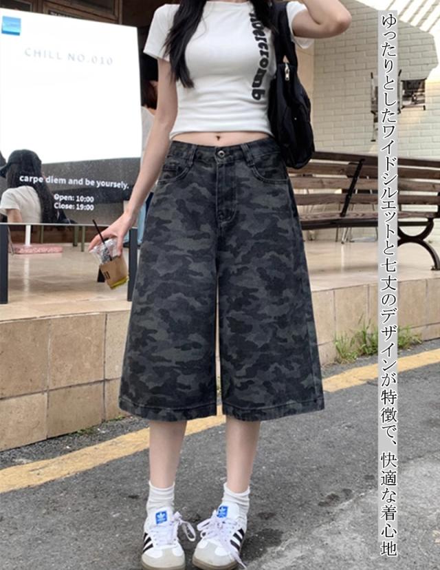 送料無料 レディース カモフラージュ柄 カジュアル デニムショーツ カーゴパンツ 七丈 パンツ ボトムス ワイド 迷彩 ストリート 韓国ファッション ゆったり ミリタリー クロップド