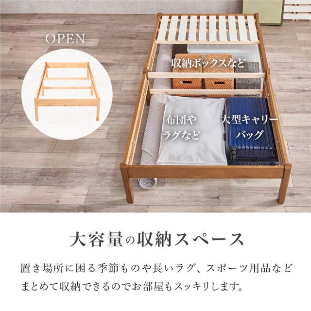 ベッド下には布団や収納ボックス、キャリーバッグまで収納可能なスペースがあり、お部屋を広く使いたい方にも最適です。