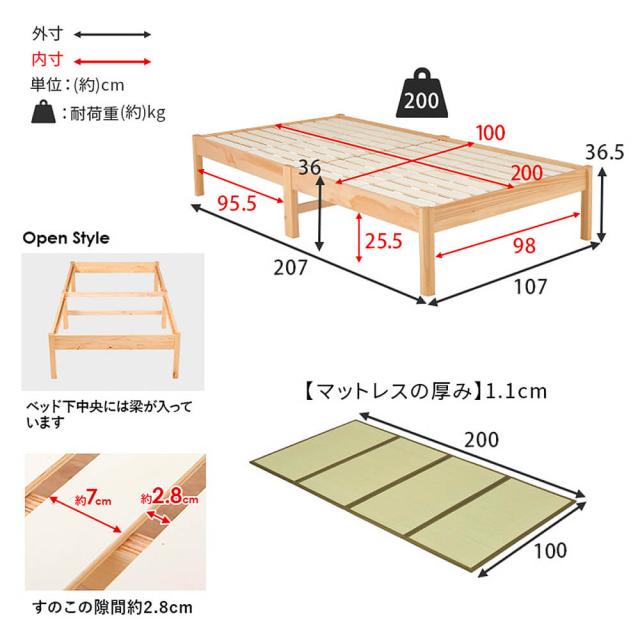 本体 : 幅 107 cm x 奥行 207cm x 高さ 36.5cm耐荷重 : 200 kg