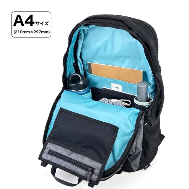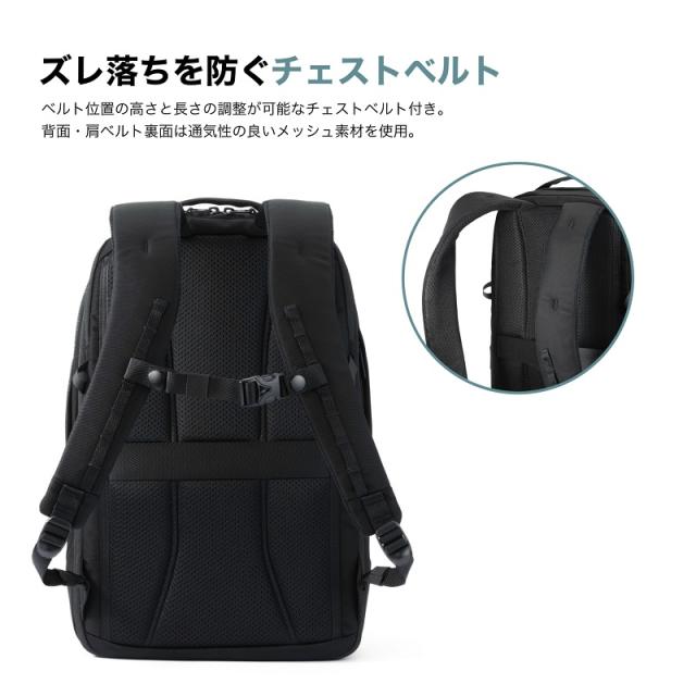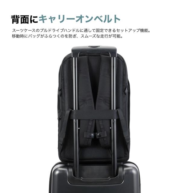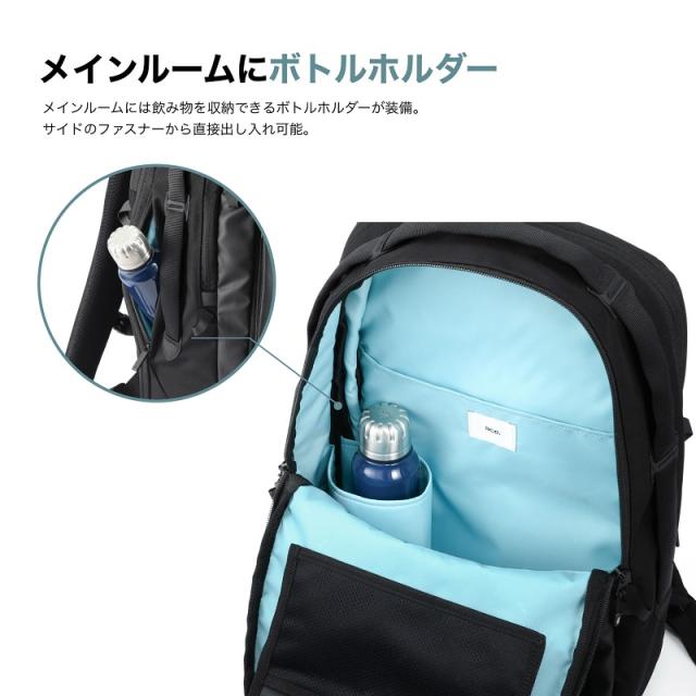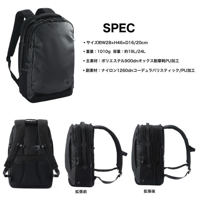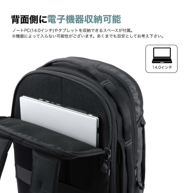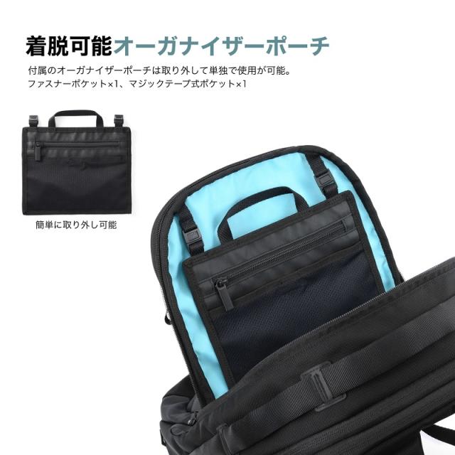 | ポケット | [外側]上部ファスナーポケット×1(メッシュファスナーポケット×1、フック×1)、サイドファスナーポケット×2、(内1つオープンポケット×1) [内側] メイン1:オープンポケット×1、ドリンクホルダー×1、オーガナイザーポーチ×1(着脱可能) メイン2:PCポケット×1(14.0インチ収納可能) |