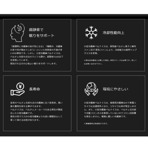 従来のペルチェ冷却方式の冷蔵庫に比べ長寿命。買い換え費用を抑える事ができます。