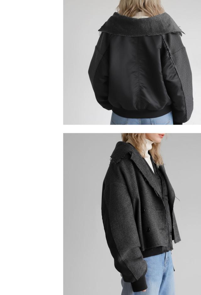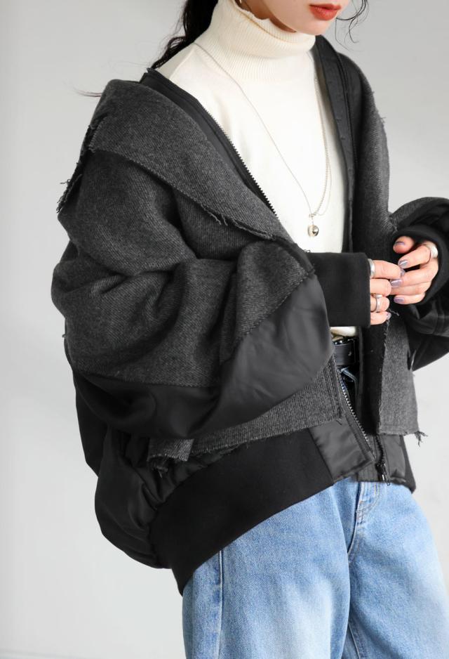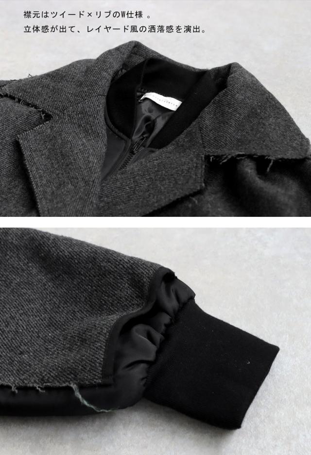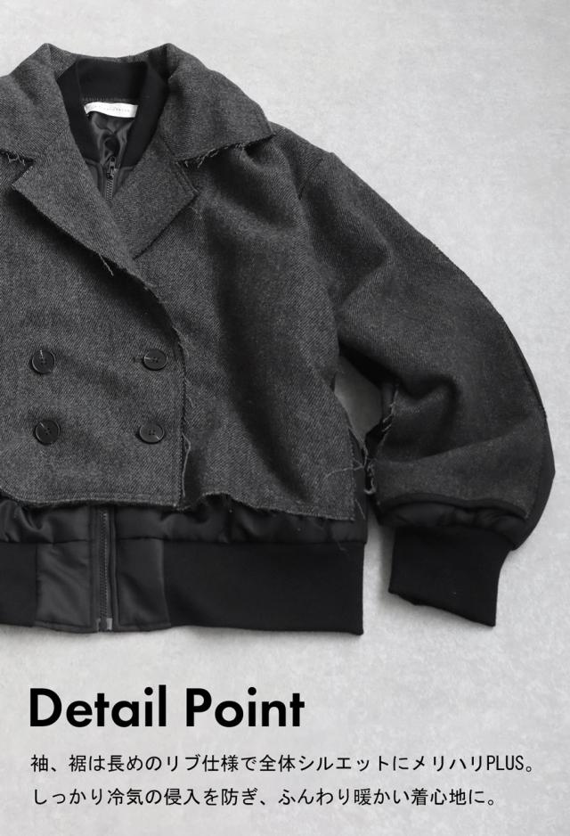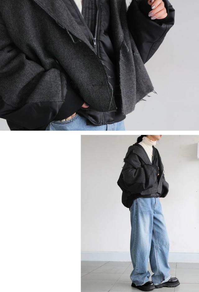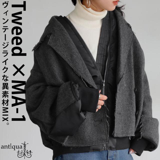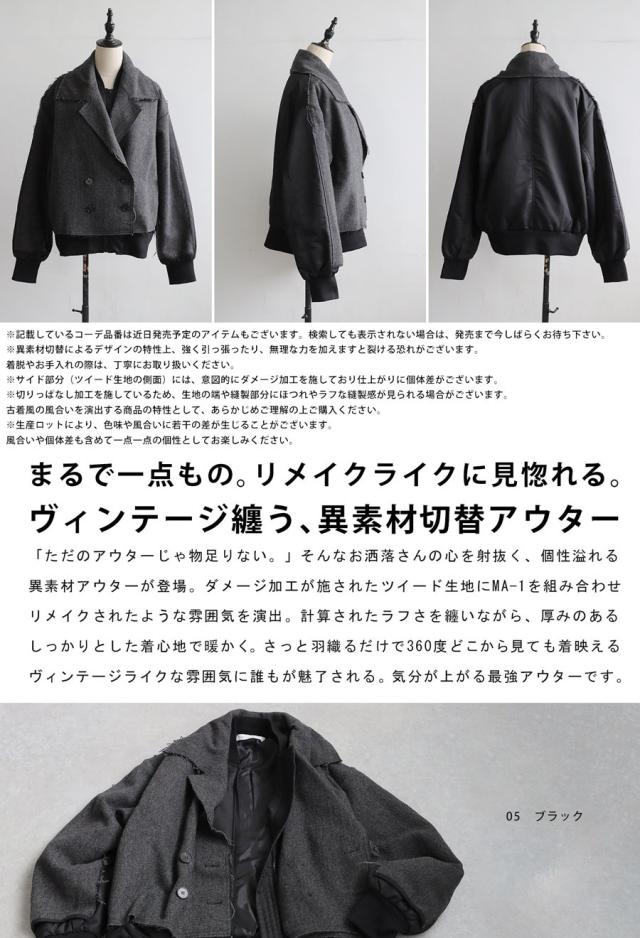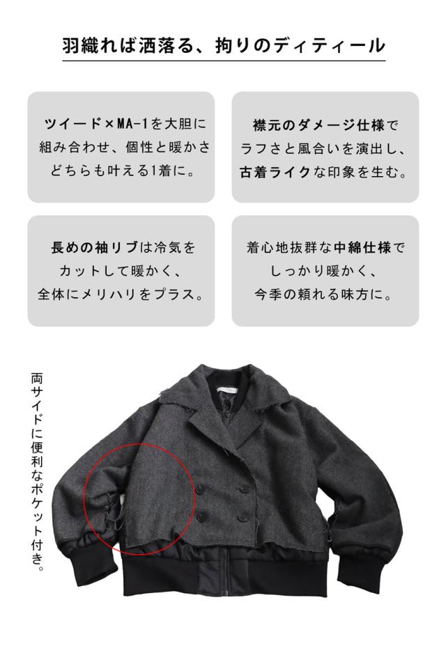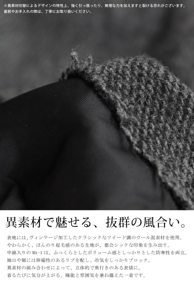 ツイード風ジャケットにMA-1デザインを大胆にドッキングした、異素材切替が映えるヴィンテージライクなアウターです。