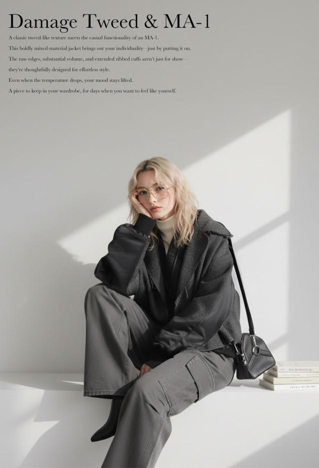 ツイード調のクラシカルな風合いと、MA-1のスポーティな要素が絶妙に融合し、唯一無二の存在感を放ちます。