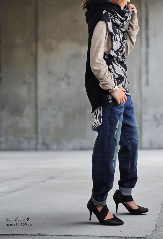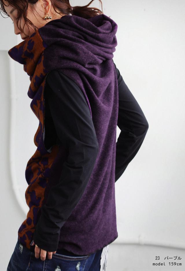 サイドの開き部分は袖口として腕を通すこともでき、まさかの“着るスヌード”として、ワンピースやベストとしても着回し可能。