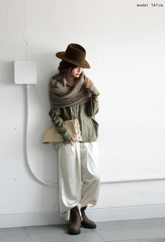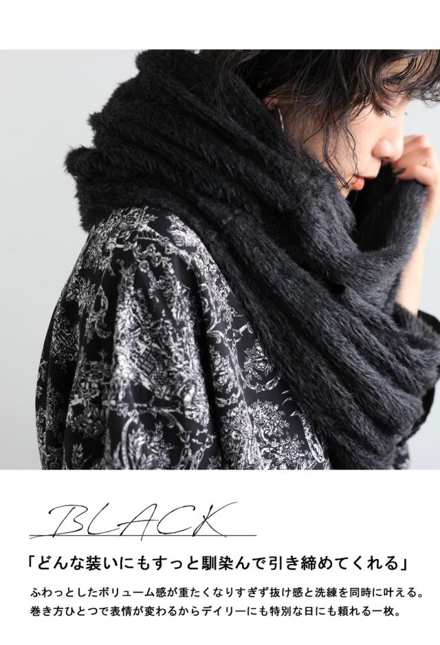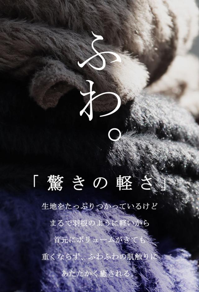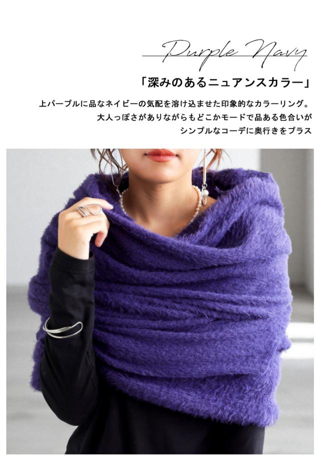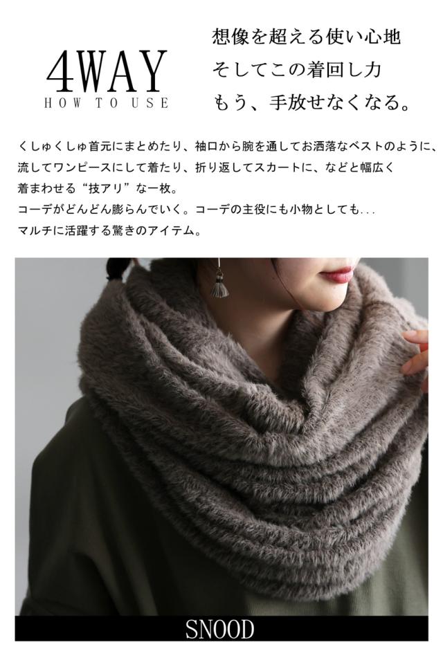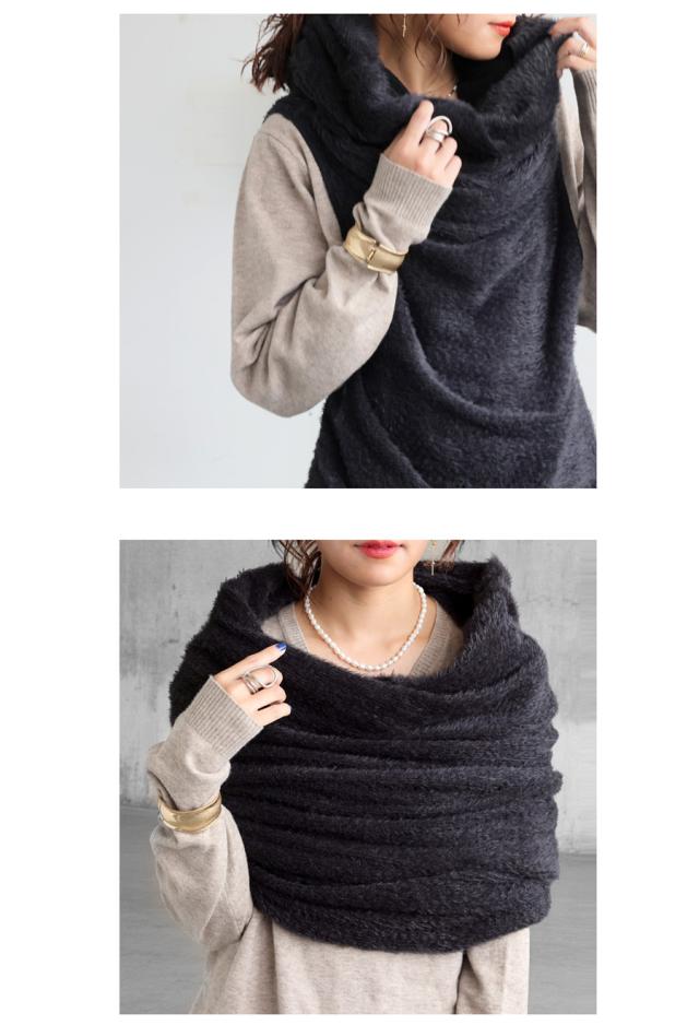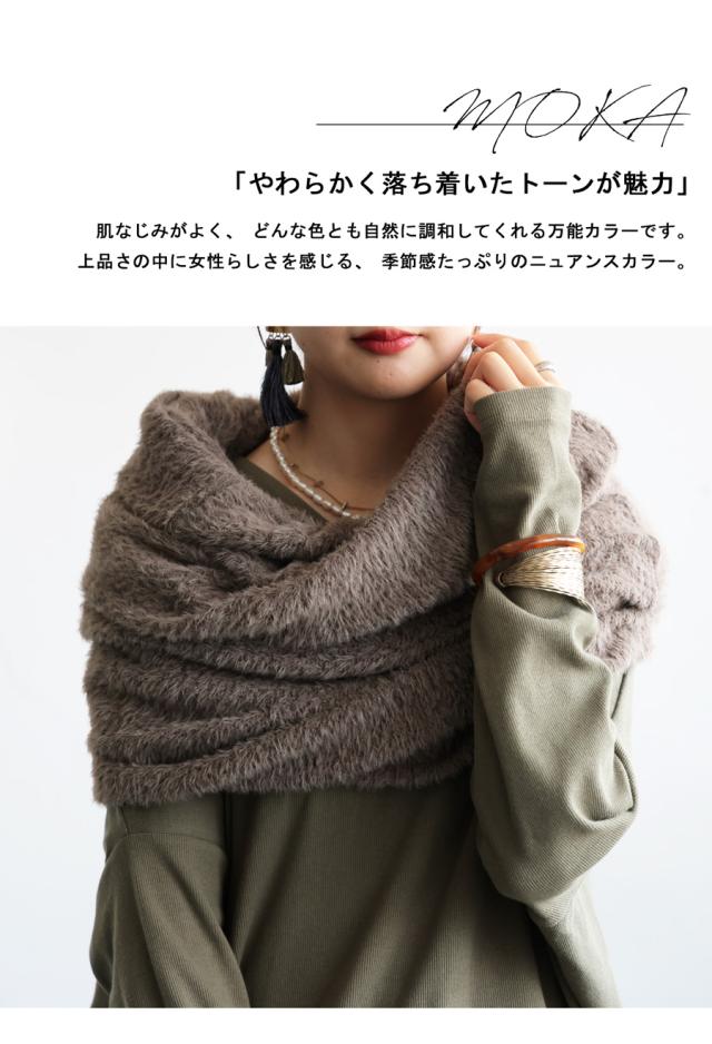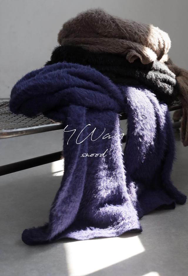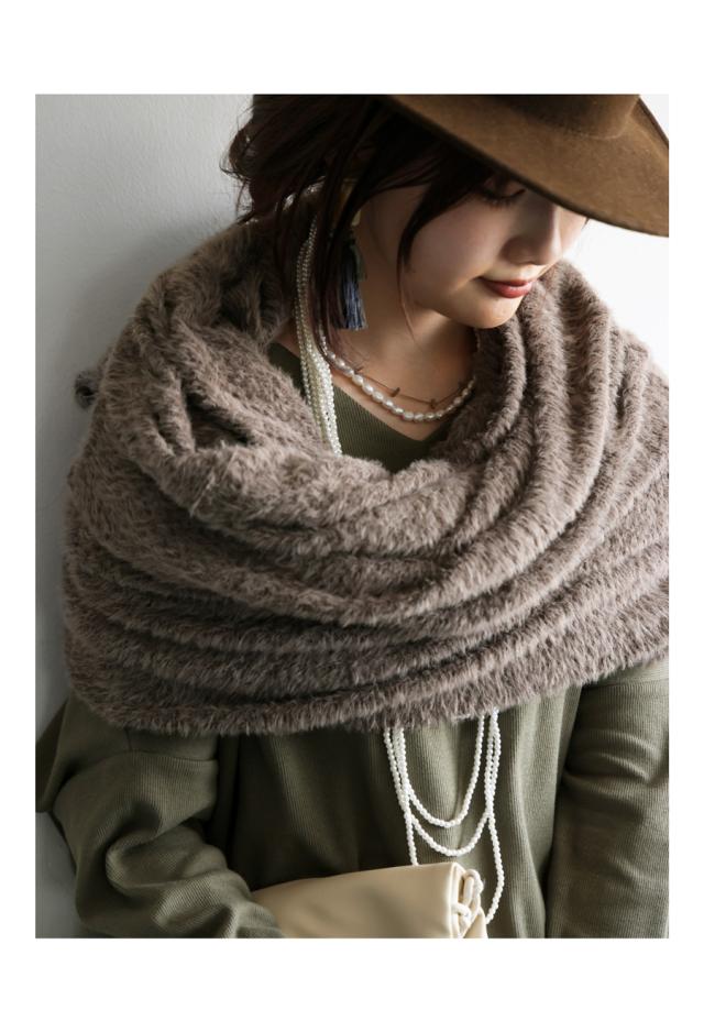 毛足の長いシャギー素材が生み出す、ふんわりとしたぬくもりと軽やかさが魅力の4WAYスヌード。