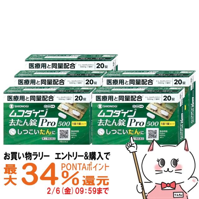 【お買い物ラリー 最大34%還元】【第2類医薬品】[セット]ムコダイン 去たん錠Pro500 20錠×5個(セルフメディケーション税制対象)[シオノギヘルスケア][せき・のどの痛み][送料無料](6057474-set3)